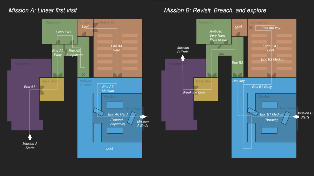 In another POI “Community College”,  I designed a double-directional layout to host 2 missions, increasing the content efficiency of the space.