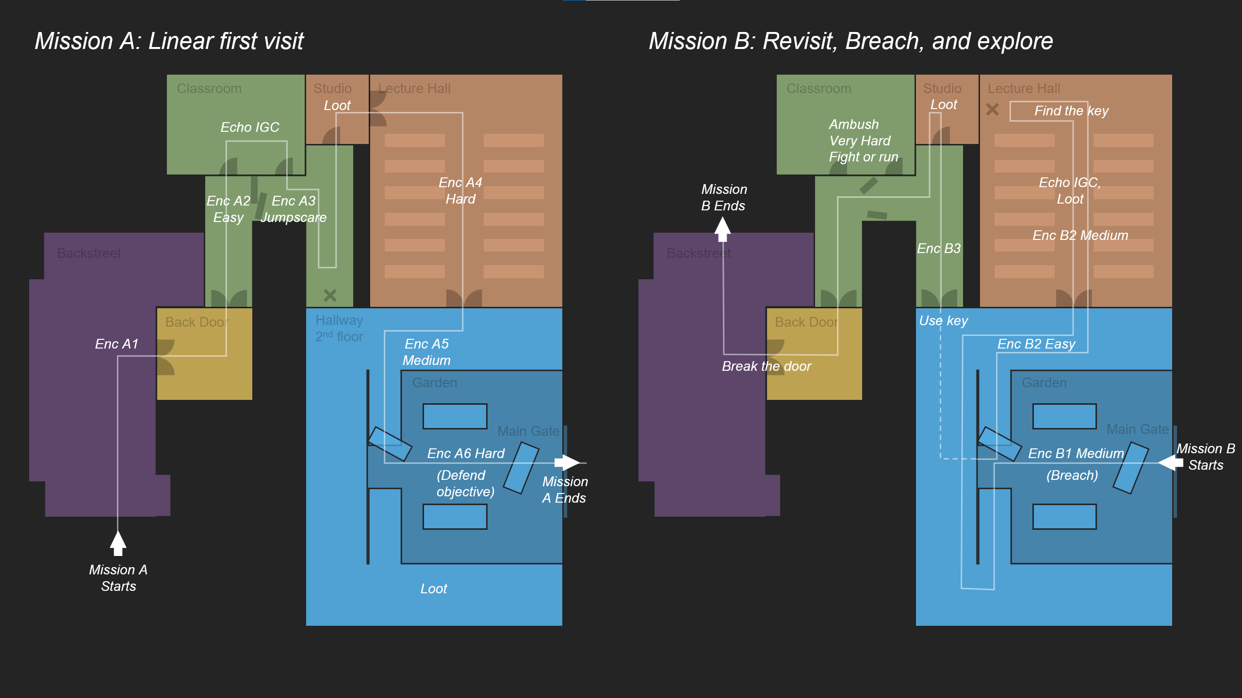 Mission A: Secretly breach from back door, go through each section linearly with progressively intense encounters.